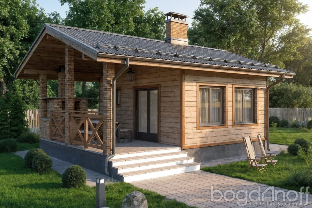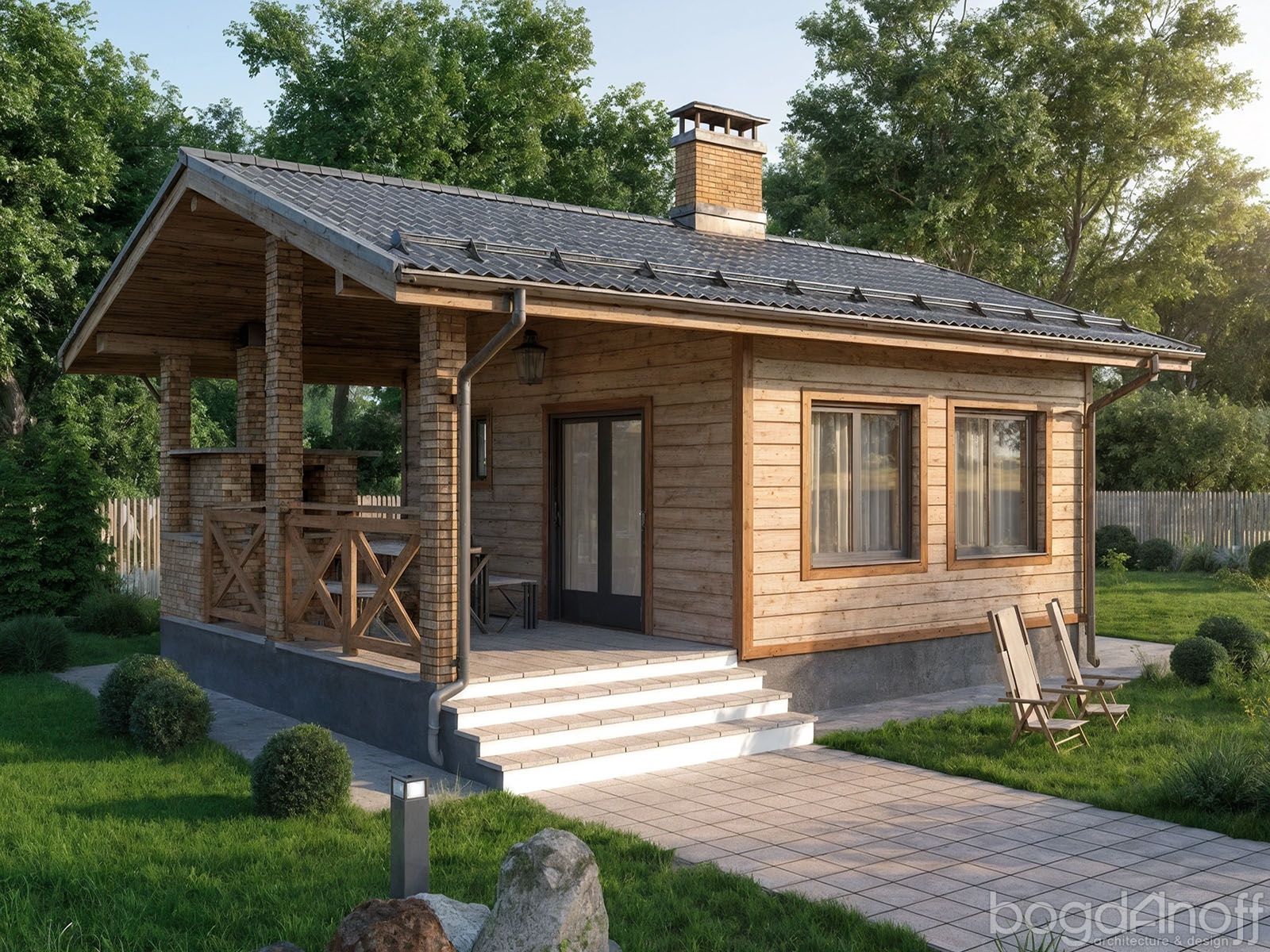 Проект небольшой баньки 6х8м. Все необходимое для удобного времяпрепровождения находятся в основном объёме 5х6м. Фасад бани отделан имитацией бруса.