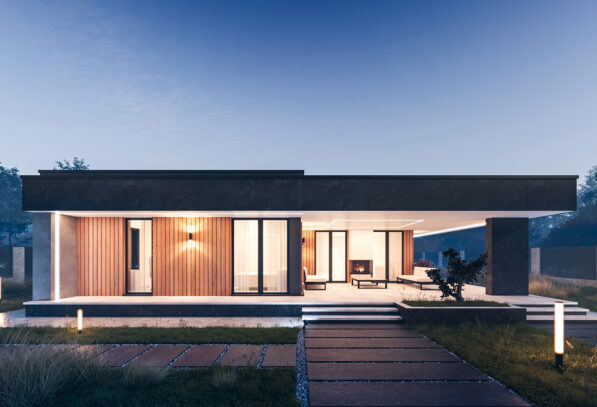 Этот современный одноэтажный жилой дом с плоской крышей идеально сочетает стиль и функциональность.
