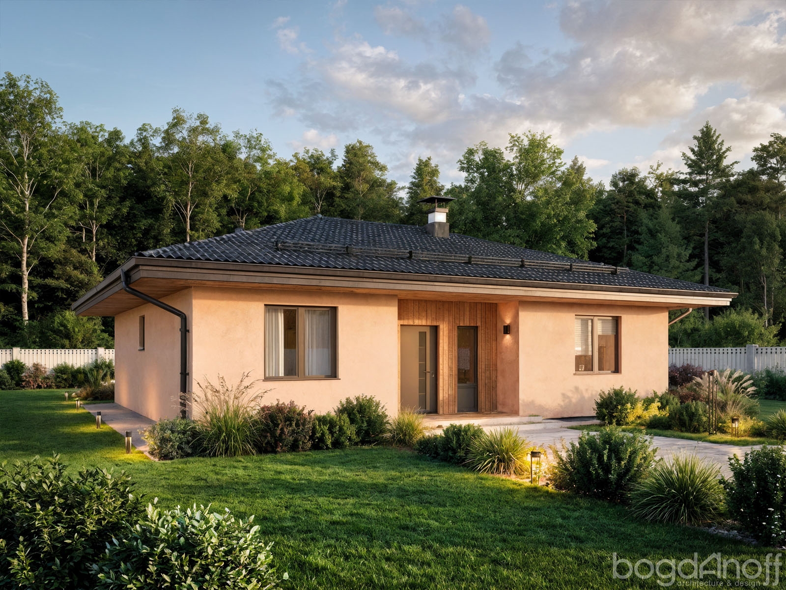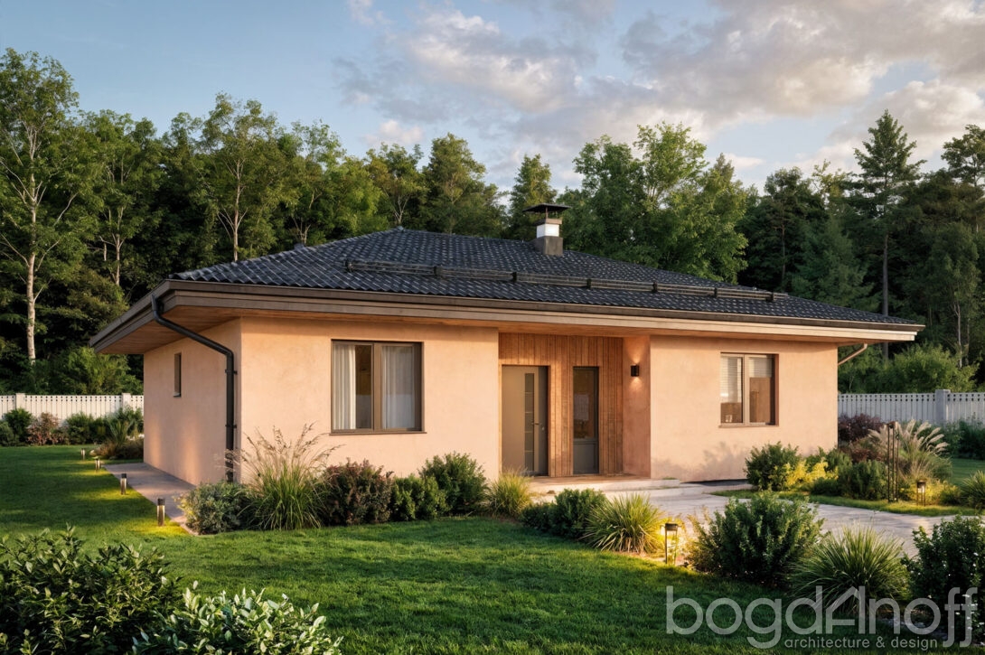 Проект одноэтажного компактного дома общей площадью 90 квадратных метров предлагает комфортное и функциональное проживание для семьи.
