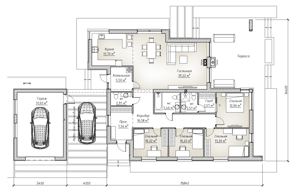 Гараж на один автомобиль и дополнительный навес защитят ваши транспортные средства и создадут удобство в любое время года.