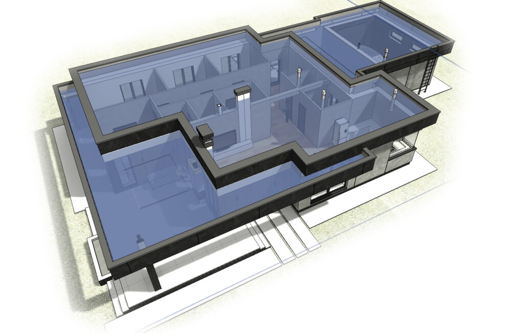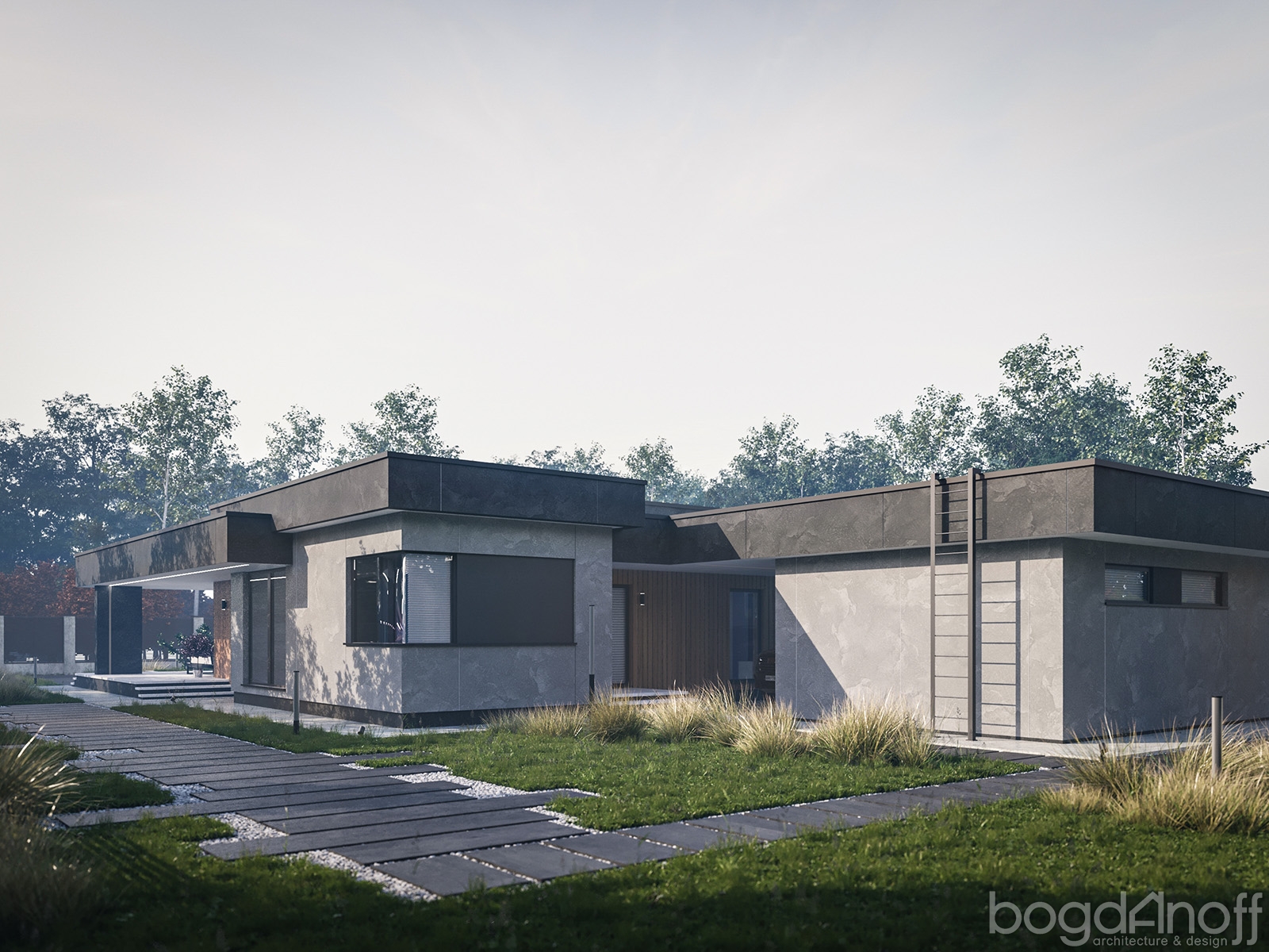 Плоская крыша не только завершает современный облик дома, но и открывает потенциал для обустройства зоны отдыха наверху с панорамным видом. Этот проект идеален для тех, кто ценит современный дизайн, практичность и комфорт для жизни.