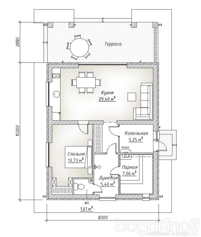 Сердце дома — просторная комната отдыха, из которой можно выйти на собственную террасу, чтобы насладиться свежим воздухом. За уют и тепло отвечает собственная мини-котельная.